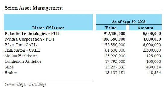 提前两周公布的13F文件证实,Burry确实在“采取行动”。他针对Palantir的看跌期权名义价值高达9.12亿美元(相当于500万股),针对英伟达的看跌期权名义价值达1.86亿美元。不过,文件未披露期权的实际支付权利金、行权价及到期日。