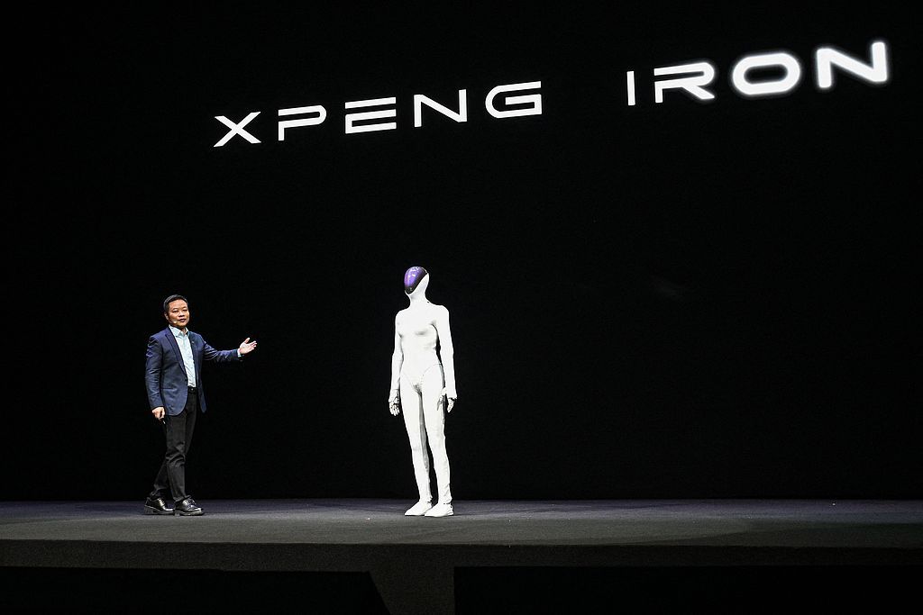 当地时间2025年11月5日,广东广州,小鹏汽车联合创始人、董事长何小鹏在公司总部举行的AI日新闻发布会上,发布小鹏汽车下一代Iron人形机器人。视觉中国 图