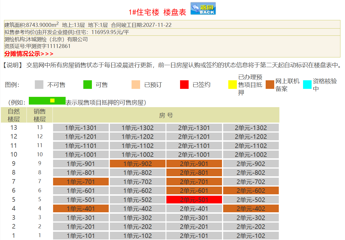 紫京宸园1号楼销售情况。截自北京市住建委官网