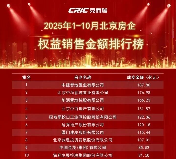 中建智地是央企中国建筑旗下中建一局下属地产平台,总部位于北京。根据克而瑞榜单,2020年中建智地在北京市场权益销售金额排名还在30以外,而今年1-10月,中建智地已来到了榜首,权益销售金额187.8亿元。