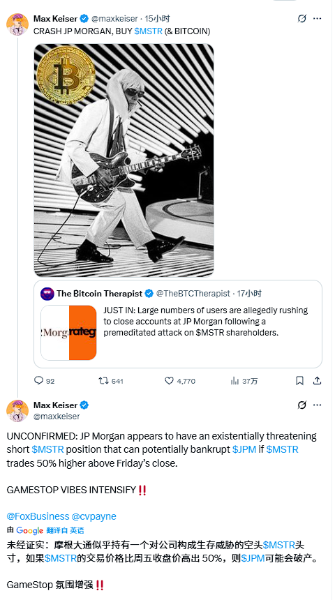 这场网络抵制运动迅速发酵,据报告显示,大量用户正涌向摩根大通要求关闭账户。更有甚者,币圈开始流传摩根大通对MSTR持有“存在威胁性的巨额空头头寸”的传言,声称如果MSTR股价较上周五收盘价上涨50%,可能导致摩根大通破产。