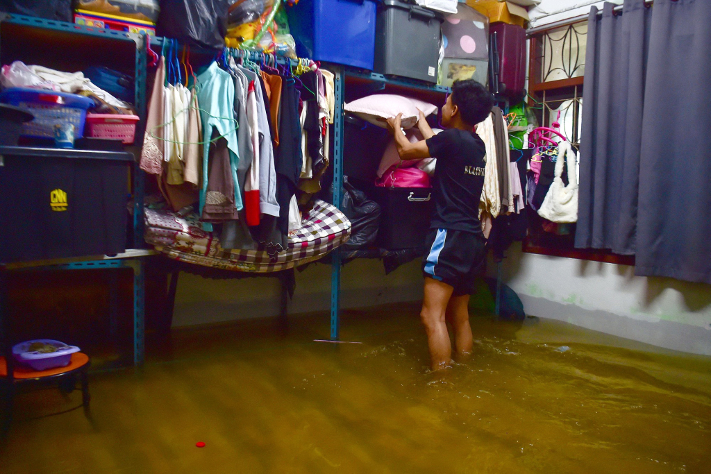 11月25日,泰国那拉提瓦府,穆昂区班亚康地区,一名居民在被洪水淹没的家中收拾物品。