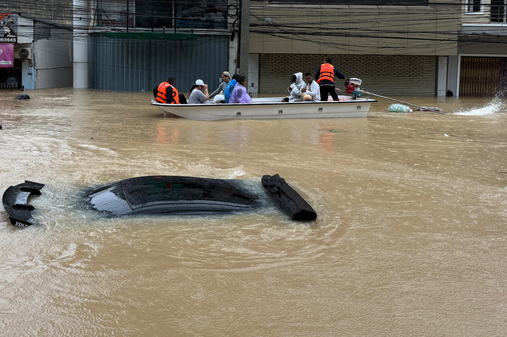 当地电视台画面显示,洪水冲过合艾市多条商业街,多辆汽车被冲走,不少人紧抱水上漂浮的泡沫箱当作“救生圈”。救援人员用橡皮艇、水上摩托、军用卡车等交通工具帮助疏散受灾居民。
