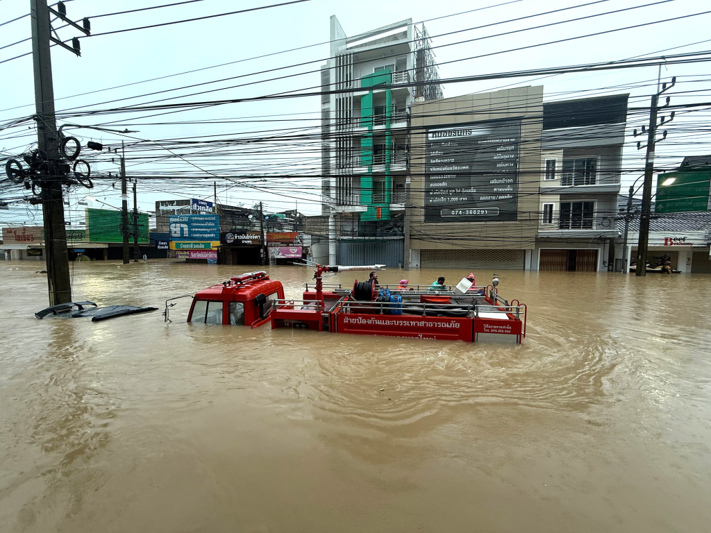 11月24日,泰国南部宋卡府,一辆消防车被洪水淹没,人们在车上避难。
