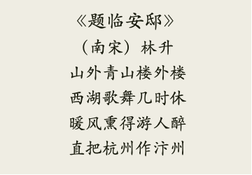 内容大致是批评南宋君臣整日耽于享乐,显然已将杭州当做汴州(即开封),准备就此于东南偏安,不欲北返河洛、收复中原。作者林升在诗歌史、南宋文学史上并不重要,他生活在南宋中期,当时南宋朝廷几次北伐的尝试均遭失败,对北伐胜利不再抱有希望,所以从宋高宗在位的中后期开始,便打算以江南为“家”、不再回到河洛,因此林升以诗作批评。不过从这种批评之词中,我们也可读出别样的意味,即南宋君臣安居之感,甚至觉得江南生活之美好。