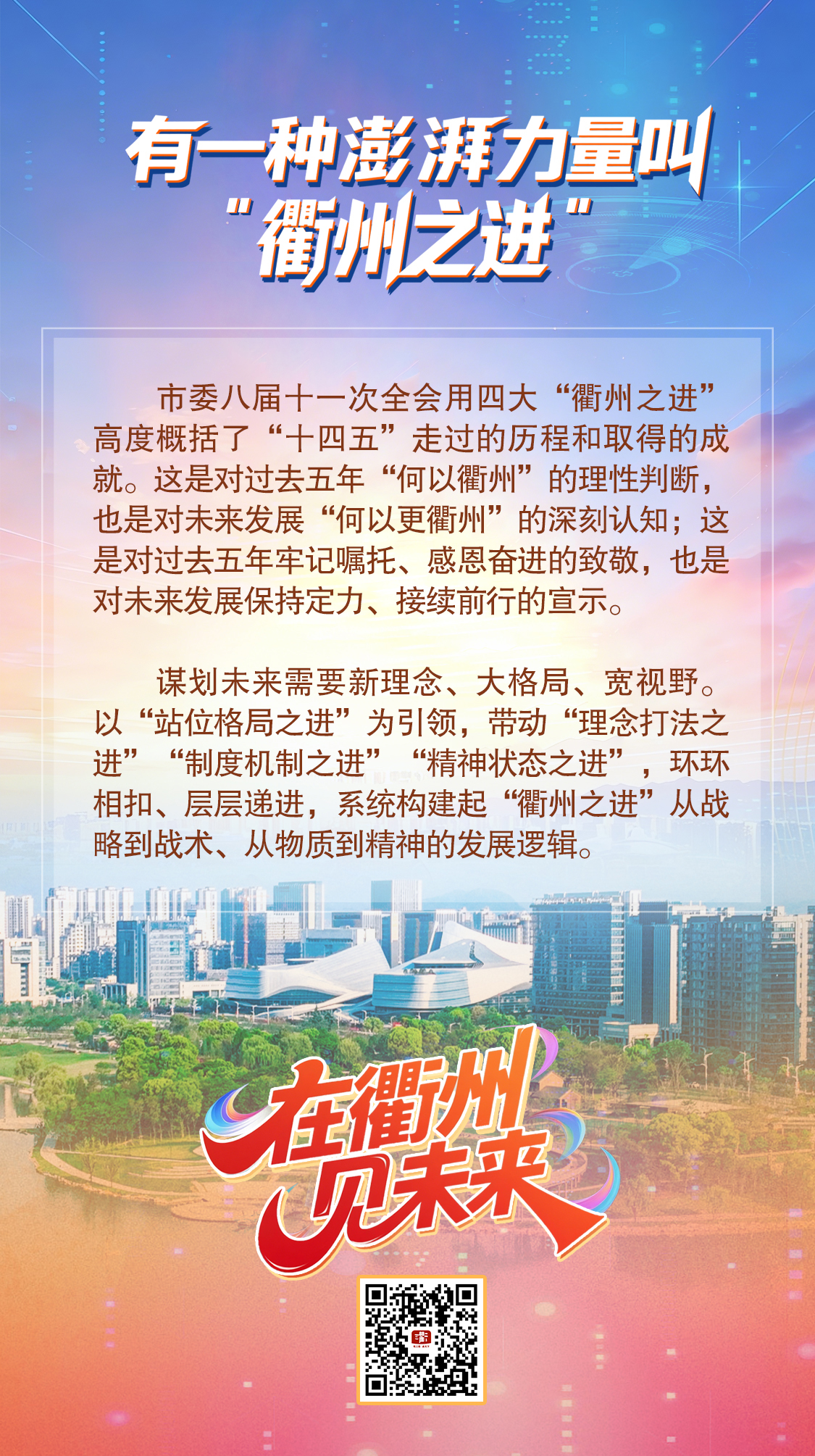市委八届十一次全会用四大“衢州之进”高度概括了“十四五”走过的历程和取得的成就。这是对过去五年“何以衢州”的理性判断,也是对未来发展“何以更衢州”的深刻认知;这是对过去五年牢记嘱托、感恩奋进的致敬,也是对未来发展保持定力、接续前行的宣示。