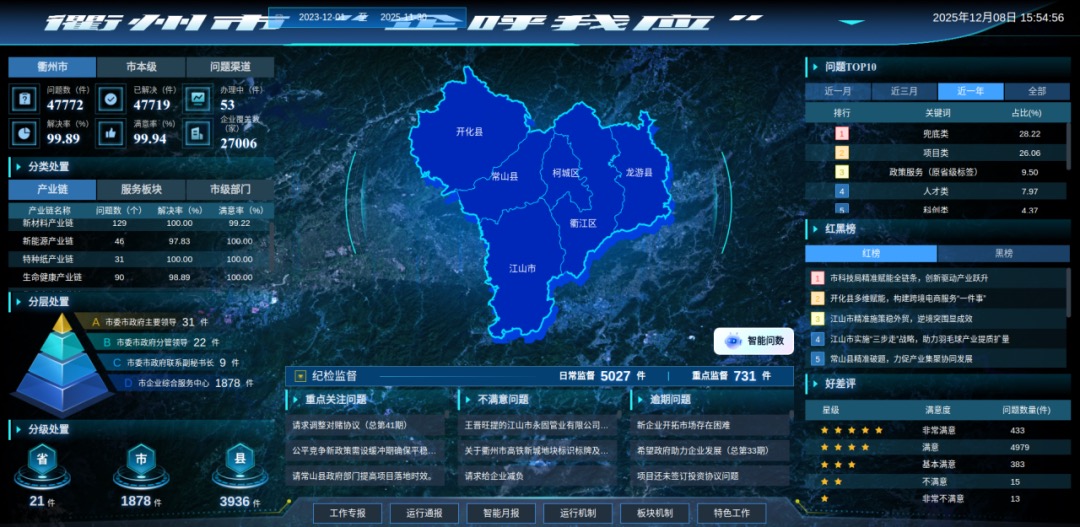“有问题手机下单,‘企呼我应’平台接单后上门服务,还提供售后服务。企业主从以前‘不敢讲、不愿讲’到现在‘愿意提一些更尖锐的深层次问题’。”开化七一电器股份有限公司董事长余永松感受很深,企业可以随时随地反映诉求,并且在线提交诉求后就不用管,部门主动联系企业。在衢创业的企业家们说,如今办事情“不找书记找机制、不找关系找平台”。自2023年12月“企呼我应”机制建立以来,已累计收集涉企问题4.6万个,解决率和满意率均超过99%。这一做法已在全省推广。