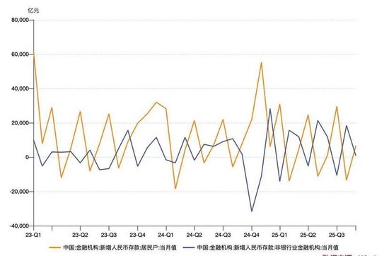 基于各部门资金需求情况和银行业绩考核等季节性因素,居民和企业存款多在季初月份环比减少,非银存款和财政存款则多在季末月份出现下降。尤其在2025年,居民存款和非银存款呈现出更强的负相关性。