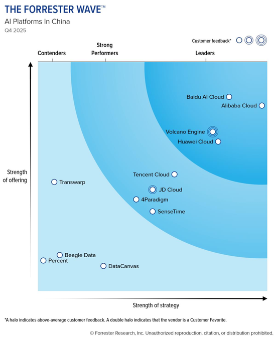 近期Forrester发布的《The Forrester Wave™: AI Platforms In China, Q4 2025》报告显示,百度智能云、阿里云双双获评行业领导者象限,其中百度智能云产品能力得分第一,阿里云战略布局得分第一。这份报告,把两家的竞争态势又一次呈现在大众面前。