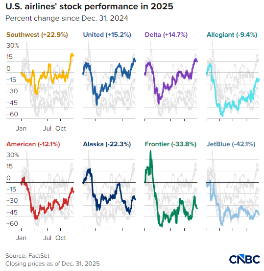西南航空股价领跑美国客运航司:2025 年该股涨幅近 23%,远超纽约证交所航空指数 5% 的涨幅,同时跑赢盈利龙头达美航空、联合航空及大盘。