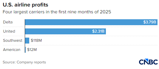 2025 年前 9 个月,达美航空与联合航空包揽了美国航空业几乎全部的利润。