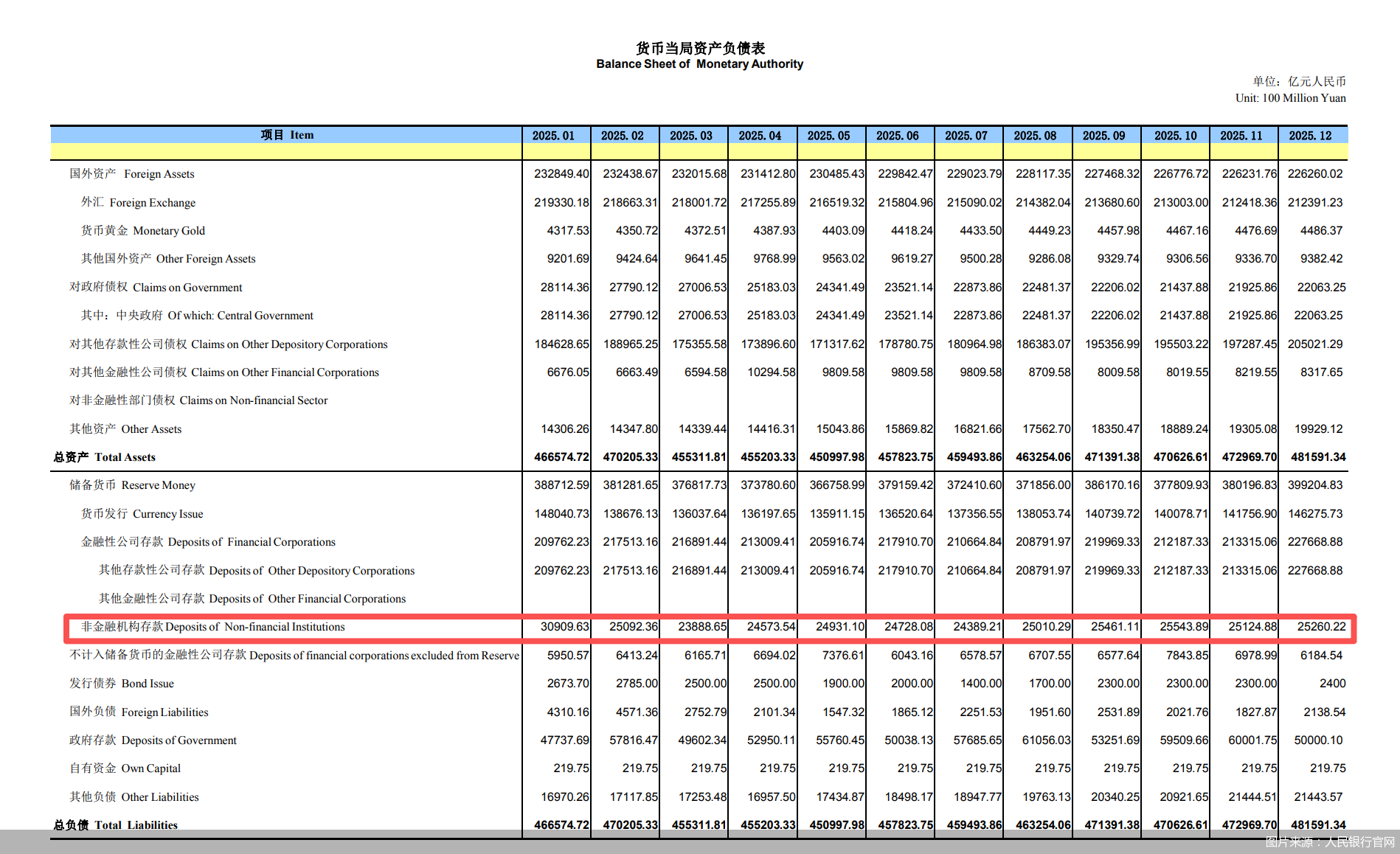 北京商报讯(记者 廖蒙)2025年支付备付金数据“收官”。1月19日,北京商报记者注意到,人民银行日前更新了最新货币当局资产负债表,第三方支付行业备付金数据一并出炉。数据显示,截至2025年12月,非金融机构存款(即“支付机构交存人民银行的客户备付金存款”)规模为25260.22亿元,较2025年11月的25124.88亿元,上升135.34亿元。2025年8月以来,支付备付金连续5个月维持在2.5万亿元上方。