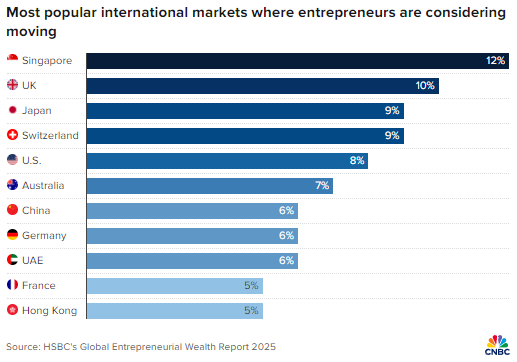 受访者提及的潜在移居目的地中,新加坡(12%)和英国(10%)占比最高,日本和瑞士并列第三(均为 9%)。尽管此次调查是在 4 月初美国总统唐纳德・特朗普宣布大范围关税政策后进行,但仍有 8% 的受访者将美国列为潜在目的地,与去年占比持平。不过,美国的 “最受欢迎移居地” 排名从去年的并列第二降至今年的第五。