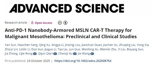 10月24日,这项名为“纳米抗体装甲化CAR-T细胞(NAC-T)”的临床研究成果,发表在最新一期出版的国际知名学术期刊《Advanced Science》(《先进科学》)。
