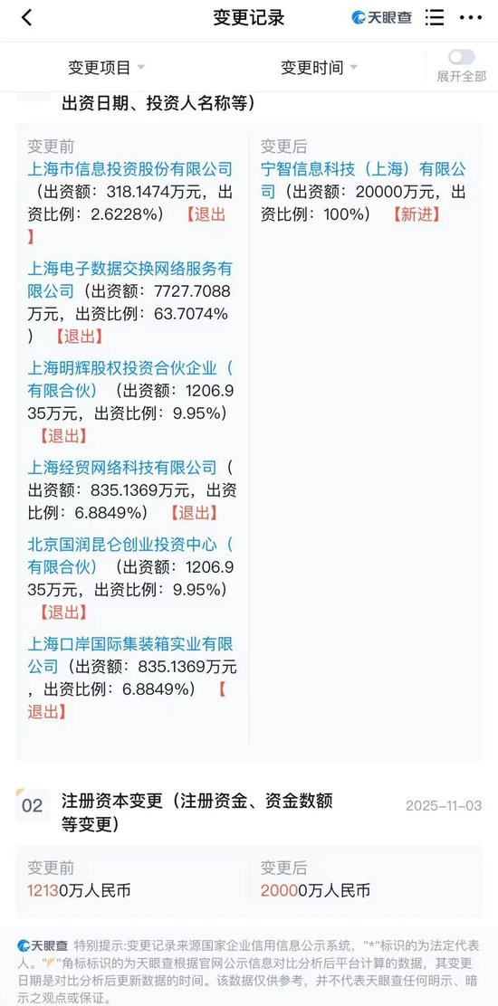 天眼查相关历史股东信息显示,此前,东方支付有6家股东,但均在2025年11月4日退出。第一家上海电子数据交换网络服务有限公司2010年首次持股,其退出时持股比例为63.7074%,认缴出资额为约7727亿元。第二、三家上海明辉股权投资合伙企业(有限合伙)、北京国润昆仑创业投资中心(有限合伙),均为2013年首次持股,其退出时持股比例均为9.95%,认缴出资额均为1206.935万元。第四、五家上海经贸网络科技有限公司、上海口岸国际集装箱实业有限公司,均为2010年首次持股,其退出时持股比例均为6.8849%,认缴出资额均为835.1369万元。第六家上海市信息投资股份有限公司,2010年首次持股,其退出时持股比例为2.6228%,认缴出资额为318.1474万元。