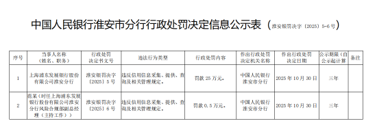11月6日金融一线消息,据中国人民银行淮安市分行行政处罚决定信息公示表显示,上海浦东发展银行股份有限公司淮安分行因违反信用信息采集、提供、查询及相关管理规定,被罚款25万元。同时,范某(时任上海浦东发展银行股份有限公司淮安分行风险合规部副总经理(主持工作))因违反信用信息采集、提供、查询及相关管理规定,被罚款0.5万元。