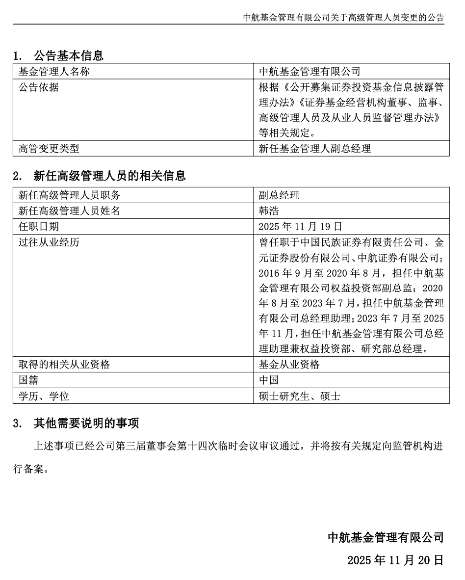 11月20日,中航基金管理有限公司(下称“中航基金”)公告称,新任韩浩为公司副总经理,任职日期为2025年11月19日。