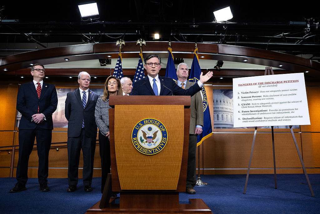 当地时间2025年11月18日,美国华盛顿特区,美国国会山,众议院议长迈克约翰逊(右)与其他共和党众议员一同出席记者会。他展示了一块标语牌,上面写着关于强制公布爱泼斯坦案文件的解除请愿书所带来“危险”的谈话要点。视觉中国 图