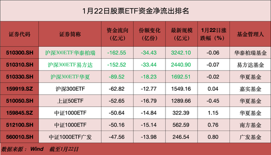 其中,沪深300ETF单日净流出居前,达467.6亿元。中证1000ETF单日净流出166亿元,上证50ETF单日净流出52亿元,创业板ETF单日净流出为35.4亿元,中证A500ETF单日净流出29.9亿元。