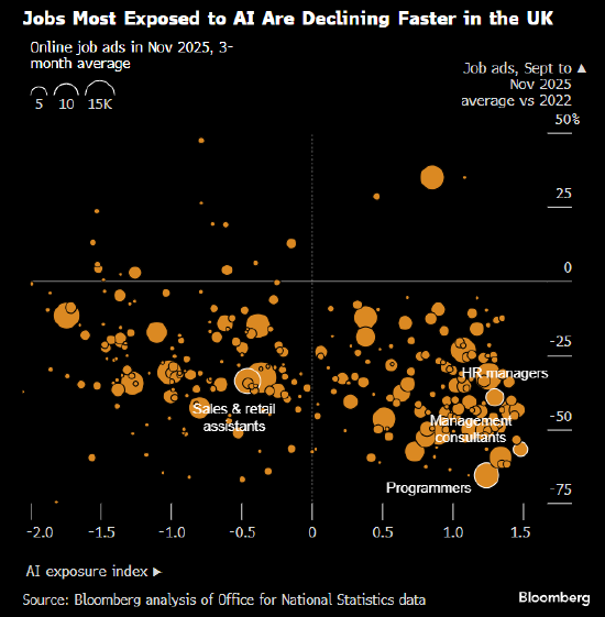 对英国国家统计局在线职位空缺数据的分析显示,虽然各行业招聘职位普遍减少,但英国企业正以明显更快的速度缩减那些可能受到AI影响的职位,包括软件开发人员和咨询顾问。