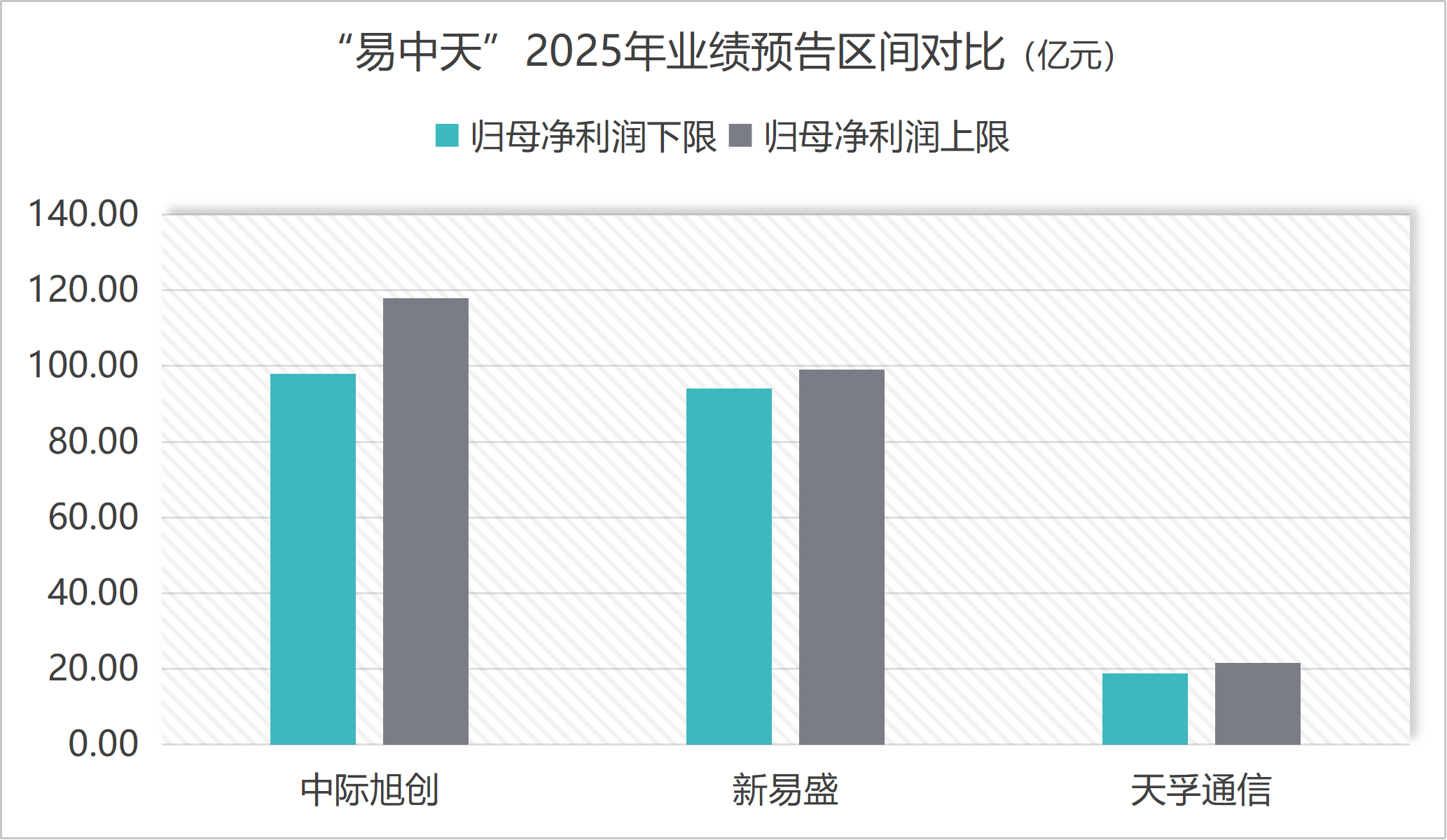 界面新闻查询发现,此前各机构对中际旭创2025年的业绩预期均超过100亿元,普遍在100亿元至112亿元之间,在预告范围之内。机构对新易盛的业绩预期86.6亿元至95亿元,多低于业绩预告范围。